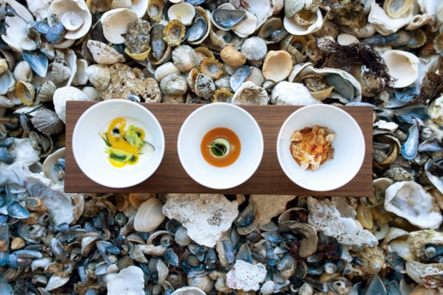 A ostra Erika teria de ser um prato obrigatório no almoço entre a imprensa e David Gelb. De facto, trata-se de uma proposta extraordinária. Na sua apresentação minimalista (negro sobre branco), na textura densa (molho) e delicada (ostra) e no sabor intenso, mas elegante. Tinha sido precedida de outro prato brilhante, “conchas e crustáceos a bordo”, um caldo perfeito com os melhores mariscos que se apanham nas águas da região. Como se não bastasse, ainda chegou à mesa um lavagante grelhado, com cenoura e capuchinha. Porém, Alexandre Couillon também possui grande afinidade com peixes ditos menos nobres da zona, como é o caso da cavala — que comemos fumada e servida numa espinha limpa e ainda (triturada) em “trufa” com café —, ou do badejo de textura delicada, que nos serviu com curgete, melão e leite de cabra.